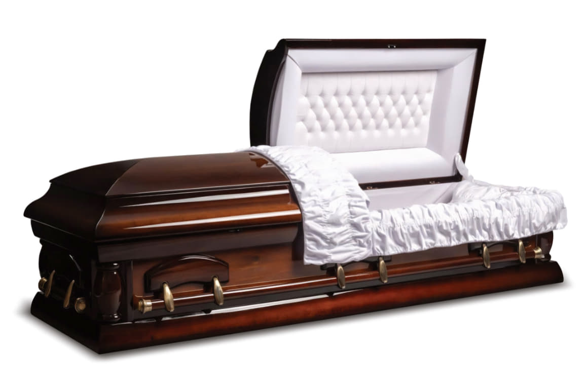 A magnificent solid European poplar open domed lid casket in a Mahogany finish. Fitted with timber swingbar handles and a premium quality interior.